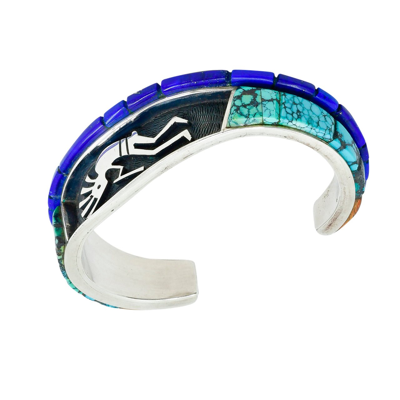 The late contemporary Hopi jeweler Phillip Sekaquaptewa had a style all his own. Some of his best pieces were cuff bracelets of cobblestone inlay set with a silver or gold figure in a center panel against an oxidized and stippled background.Â