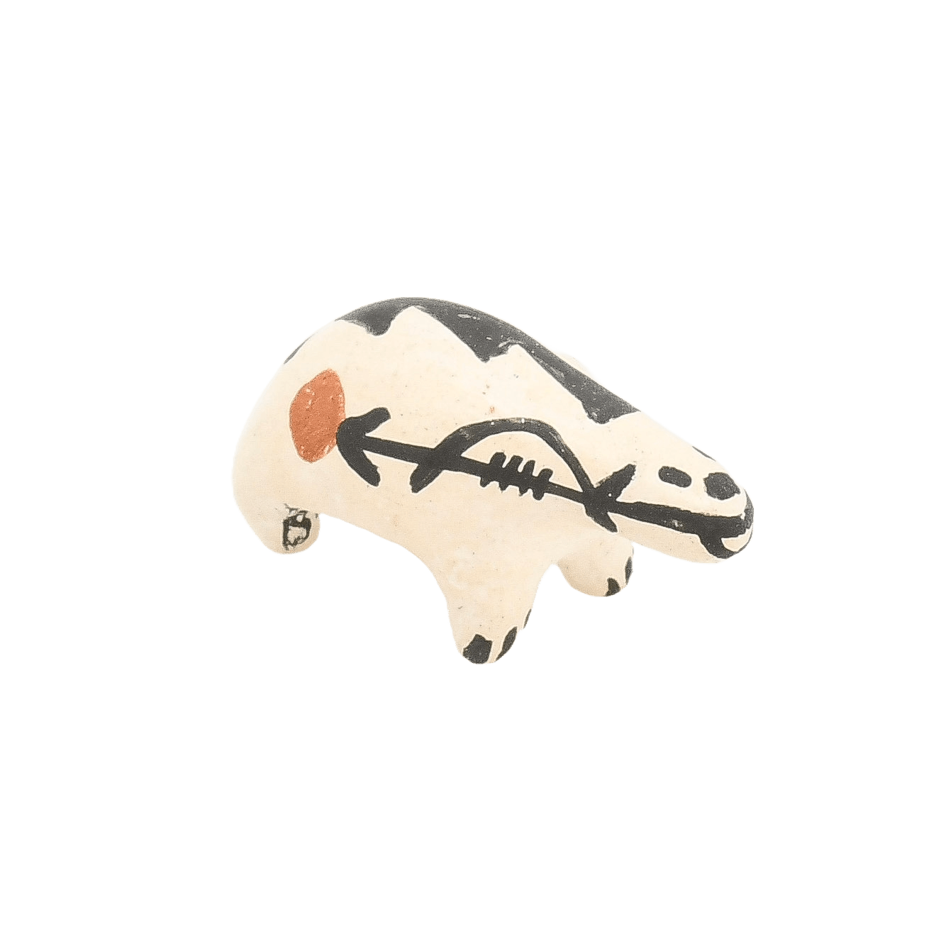 This teeny Acoma bear is traditionally black and white with a single "red" sun extending from the heart line that runs from his happy mouth. He was brought to life by an Acoma potter with the initials BLS, and marked on the bottom. Acoma potters were traditionally women.